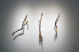 View of “Khvay Samnang: Forest Myth,” 2025. From left: Kapok Wood 1, 2025; Kapok Wood 2, 2025; Kapok Wood 3, 2025. “With the animal